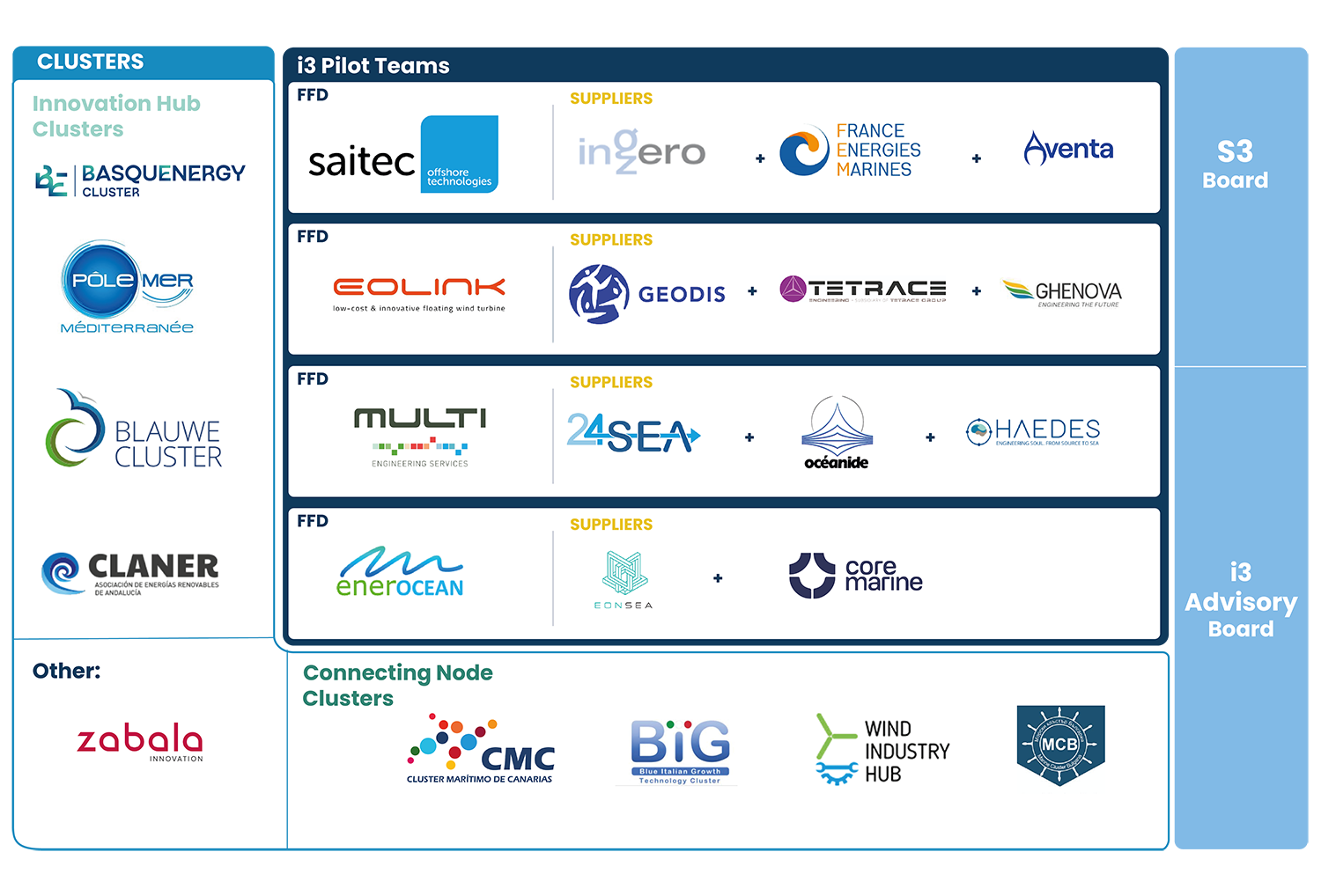 The I3-FLOAT project is a European initiative designed to strengthen the floating offshore wind value chain by mobilising interregional innovation investments and accelerating the market readiness of advanced technologies. It is funded by the Interregional Innovation Investments (I3) – Strand 1 programme and co-financed by the European Union through EISMEA. The project engages 24 partners across 8 European regions. For over 36 months, I3FLOAT will implement 10 innovation investments on four floating platforms and launch two Open Calls to support up to 50 SMEs. With a strong focus on less developed and outermost regions, the project boosts cohesion, competitiveness and sustainable growth.
